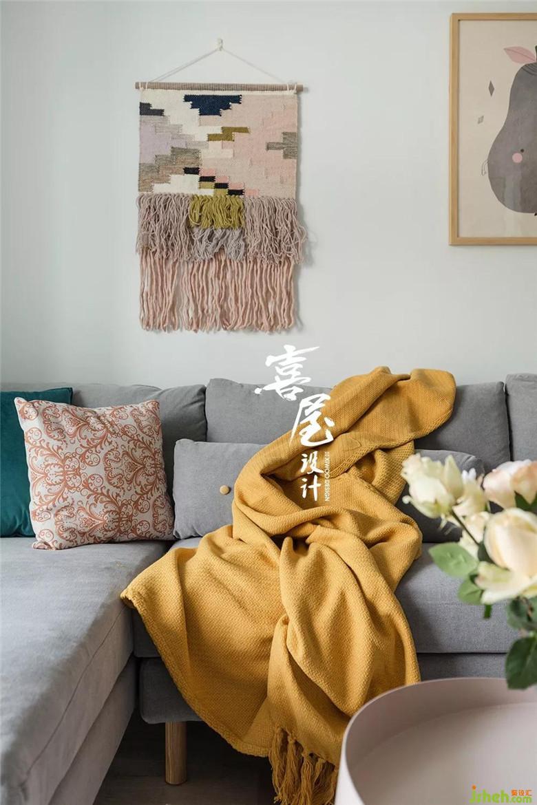 沙發(fā)背后墻體用裝飾畫與掛毯裝飾,用溫暖的間色迎接陽光的調(diào)色。