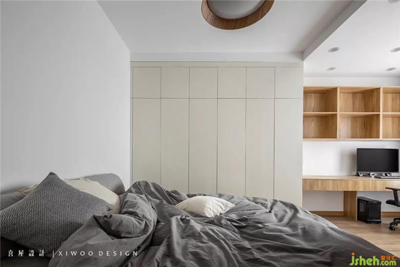 主臥以清淺的白色、靜謐的灰色和沉穩(wěn)的原木為主基調(diào),不做過多裝飾。室內(nèi)所有物件,或袒露材質(zhì)上的肌理與質(zhì)感,強調(diào)睡眠空間所需的舒適感;或融入整體感的衣柜和書桌,達到空間功能與比例上的均衡。