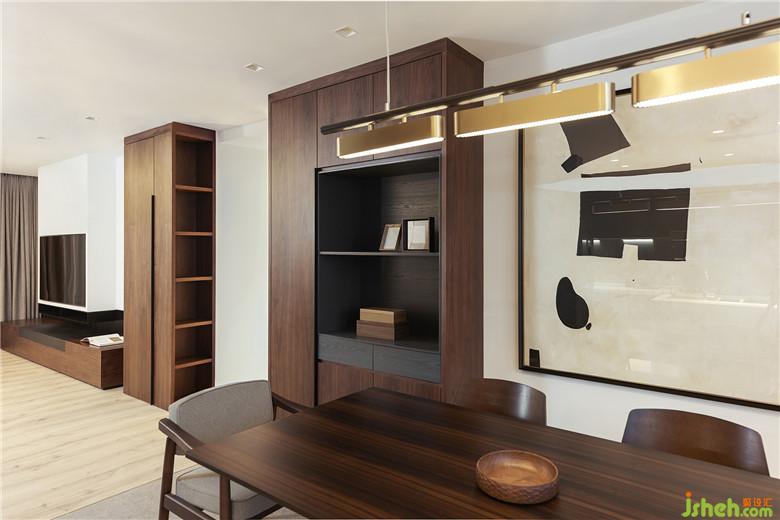 原先廚房的隔斷被拆除,從客廳白凈墻面到深色胡桃木的定制飾板和餐廳室內(nèi)設(shè)計師采用了同樣的深色胡桃木材質(zhì)的家具,再到廚房使用了深灰色帶有現(xiàn)代氣息的整體櫥柜和點綴的白色石材,營造清爽的氛圍,簡單、很有格調(diào),并將功能區(qū)清晰的劃分。