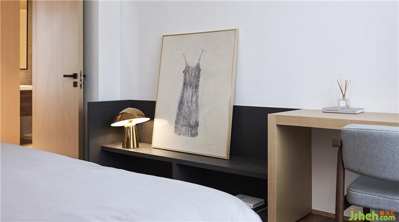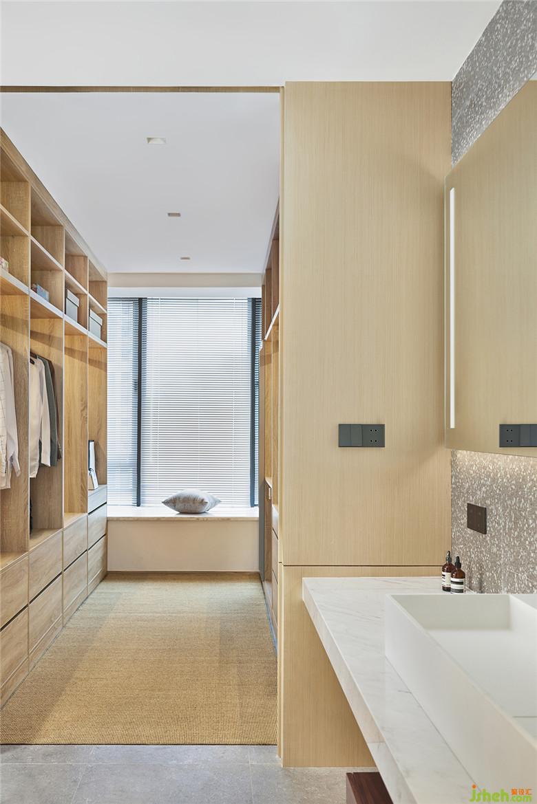 在主臥這間房內(nèi),室內(nèi)設(shè)計師完全沒有用到房門,就巧妙地串聯(lián)起房間內(nèi)休息區(qū)、衣帽間、主衛(wèi)這三個功能空間,這種簡潔巧妙的布局,使得三個空間的窗保持連續(xù)一致,將自然光和江景一同引入房間里,愜意極了。