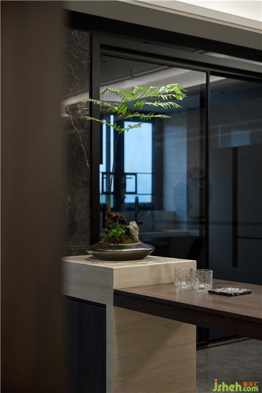 客廳與書房的綠植區(qū)采用了鋼化玻璃斜拼隔斷,使南北空氣形成對(duì)流讓植物植物更好的生長(zhǎng)。裝修設(shè)計(jì)品茗區(qū)地面采用柔和磨砂磚,植物區(qū)采用了深色的毛石上墻,為這個(gè)小小的綠植區(qū)增添了出色的背景。