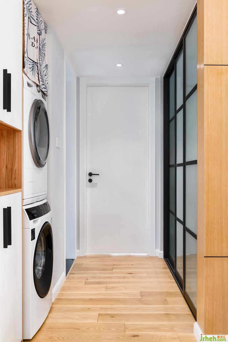 原始結(jié)構(gòu)中有個最大的缺陷就是沒有陽臺,不得已我們將洗衣機烘干機放在過道,考慮日常使用的便利性,室內(nèi)設(shè)計師并沒有做門來隱藏。