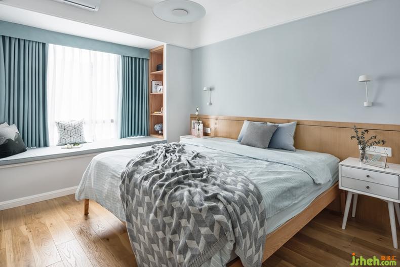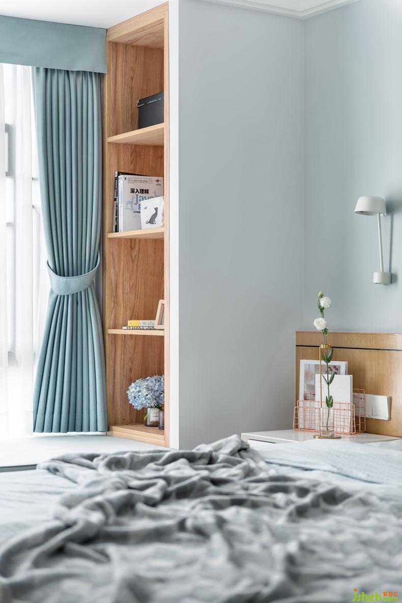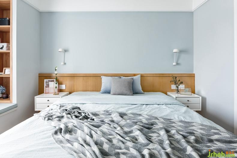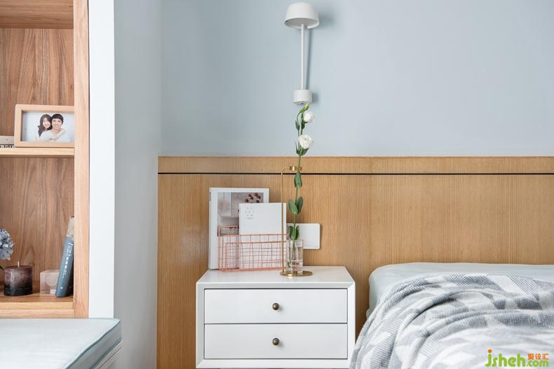 主臥采用低飽和度灰綠色,穿插原木色調(diào),營造溫柔靜謐的氛圍,針織毯隨意的搭在床上或者裹在身上,慵懶的感覺令身心愉悅。
