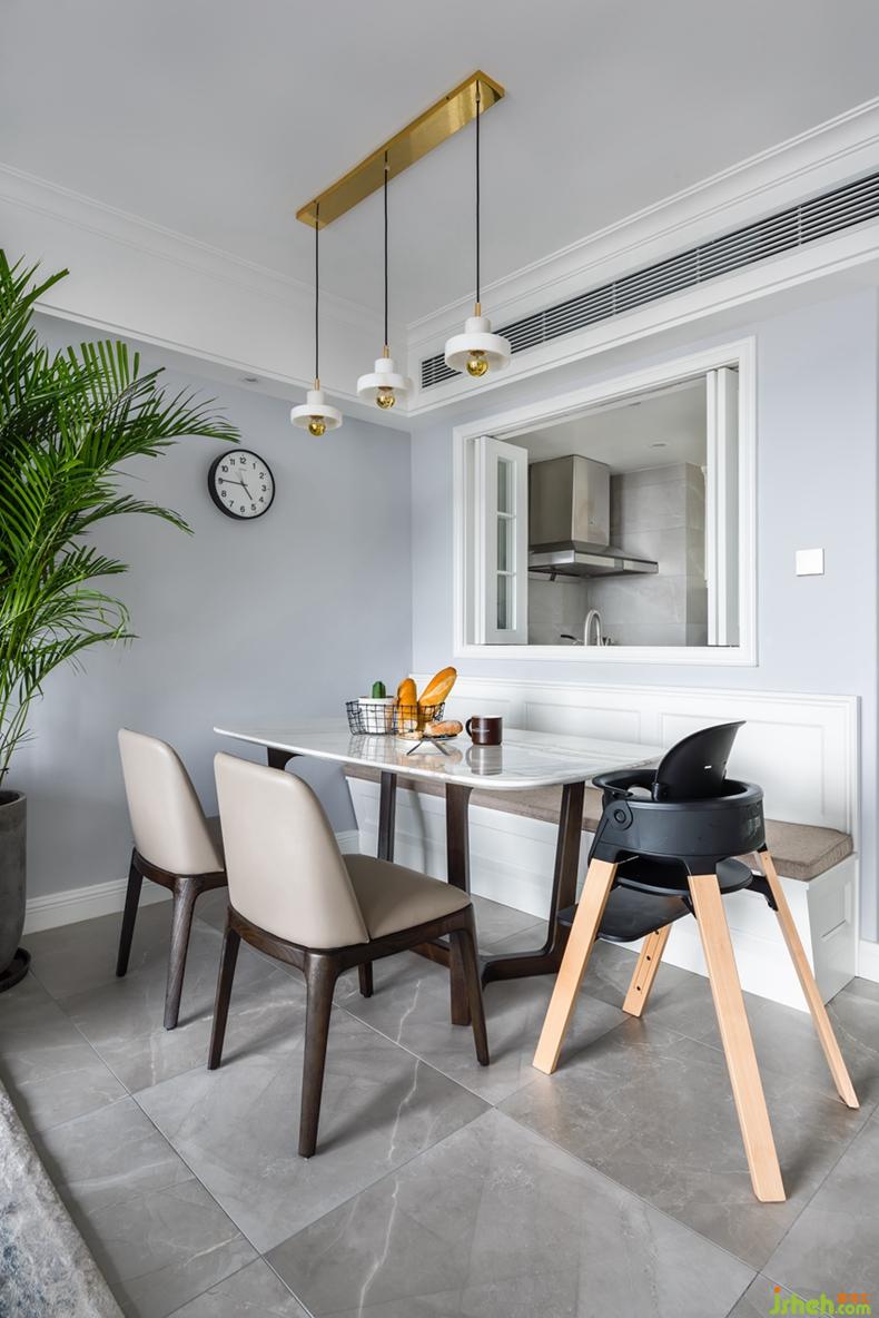 原結(jié)構(gòu)中廚房門直接面對餐廳,造成餐廳空間動線受阻,設(shè)計師將門改到過道,面對餐廳位置做了一面折疊窗,在窗下設(shè)計了卡座,豐富了視覺空間的同時又很好滿足了功能使用。室內(nèi)設(shè)計師
