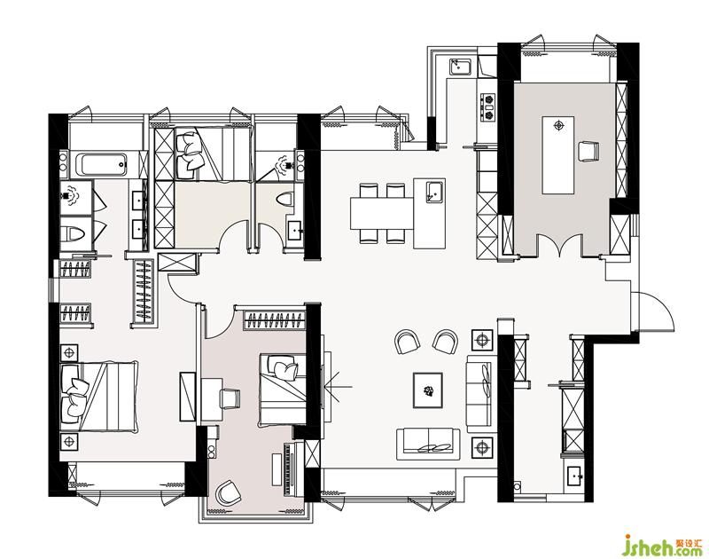 ④ 將通往臥室的過道兩旁的臥室及公衛(wèi)墻體做了內(nèi)移,取締了之前壓抑局促的過道;