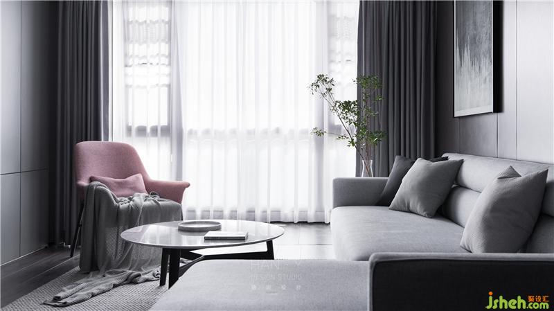 在黑灰空間中,加入木色調(diào)作為點綴,是永不過時的設計。為了平衡空間中大范圍的灰調(diào),加了點綴的嫩粉色,為冷冷的灰調(diào)添加了一絲溫和。