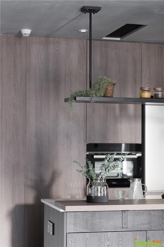 由于兩人都有喝咖啡的習(xí)慣,休閑時(shí)刻,男主會(huì)在島臺(tái)用咖啡機(jī)沖咖啡,女主則動(dòng)手做舒芙蕾松餅來(lái)進(jìn)行搭配。島臺(tái)上方設(shè)計(jì)的吊架,增添島臺(tái)的收納,也同時(shí)是操作時(shí)的照明燈。