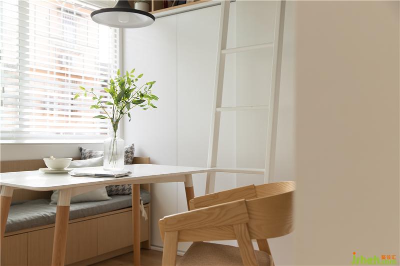 從走廊過來就是客廳與餐廳相連的空間,包括君君的學(xué)習(xí)區(qū)也在這個位置。經(jīng)過百葉簾的過濾,陽光也成了家里自然唯美的裝飾。