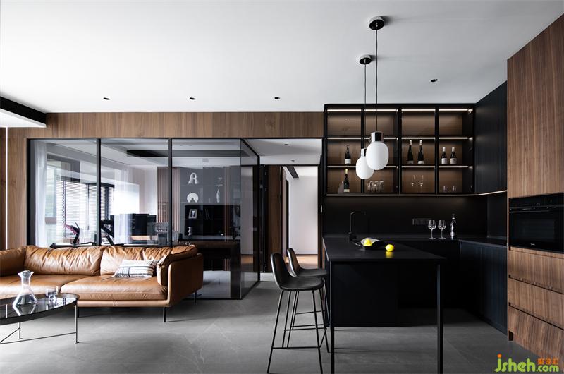 暗色系主題的家居設(shè)計語言搭配胡桃木色將空間兼蓄并收,營造出睿智而低調(diào)的獨(dú)居氛圍感,一面酒柜、一方吧臺,隱匿在黑白二元對立的酷感中,這是明亮空間里無法帶來的優(yōu)奢與神秘感……