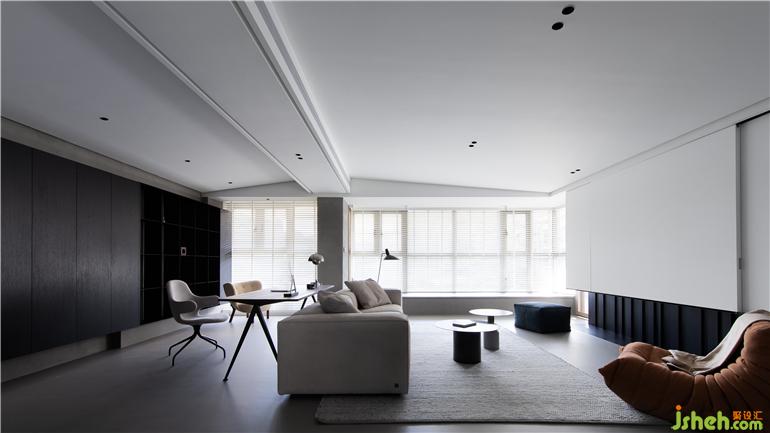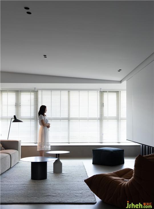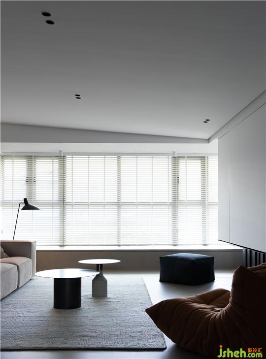 ① 將客廳與玄關(guān)區(qū)隔墻打通,打開后的客餐廳區(qū)域擁有良好的互動關(guān)系,暖灰色微水泥地面讓空間視覺表達(dá)統(tǒng)一有序。