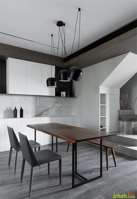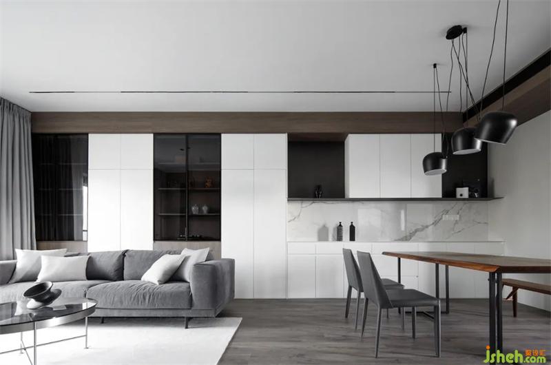 白色與木色的定制家具、大理石墻磚、黑色的鋼板、玻璃,以及素雅的胡桃木色,呈現(xiàn)出大氣脫俗的質(zhì)感。表面上看不到多余的物品,實則巧妙的藏在設(shè)計當(dāng)中。