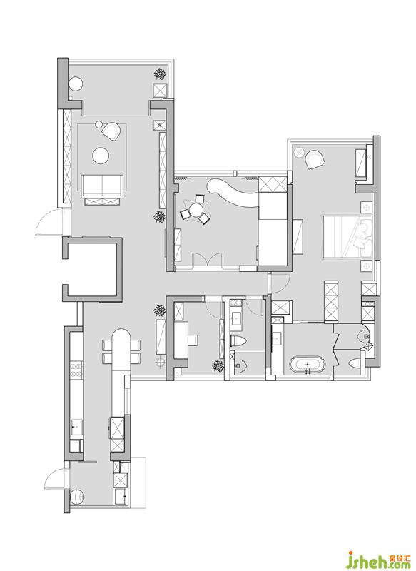 ③ 原本四房的格局改為三房,兩個次臥拆除墻體合二為一,為兩個孩子設(shè)置了超大的玩??臻g與成長天地;優(yōu)化了主臥套間的結(jié)構(gòu),陽臺的大落地窗與天窗帶來絕佳的陽光。利用玻璃門區(qū)隔衛(wèi)浴空間,形成通透開闊的空間尺度。