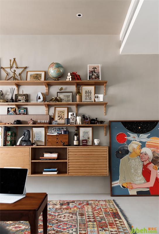 客廳的核心區(qū)是一面陳列柜,源自于中外各地的器皿物件靜靜地在此大放異彩,成為家中特殊的記憶符號。一旁甜蜜的肖像畫作,是友人贈予屋主夫婦的禮物,“來?!焙汀斑溥洹币参涣衅渲?,更為空間增添了幾分隨性與趣味。