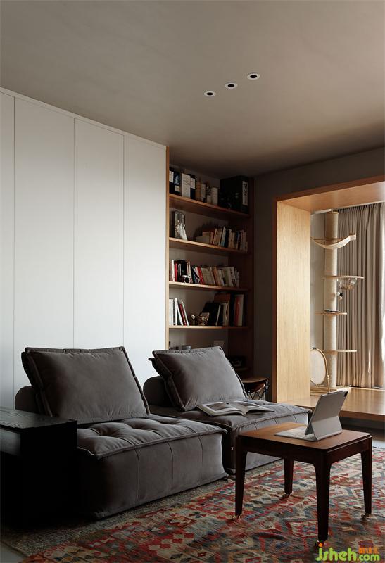 沙發(fā)背后的書柜墻用于展示和收納。盛滿陽光與溫暖的地臺溢出陽光于書本之上。配上最愛的紅酒,身邊蜷縮著軟綿綿毛茸茸的貓咪,孩子在陽光下搭著積木……空間向外延展帶來的釋懷感和被溫暖擁抱的溫馨放松都在當下被實現(xiàn)。