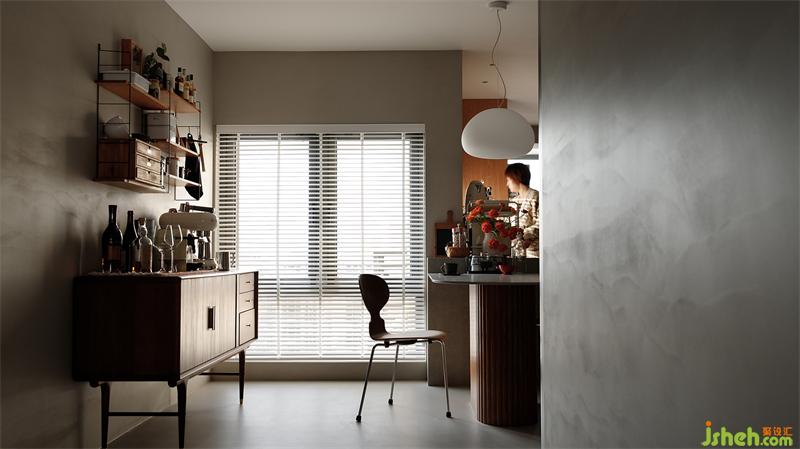② 餐廳與廚房空間打通,形成開放式的一體化餐廚區(qū),并在餐邊柜處實現(xiàn)了屋主最常用的咖啡制作區(qū)。