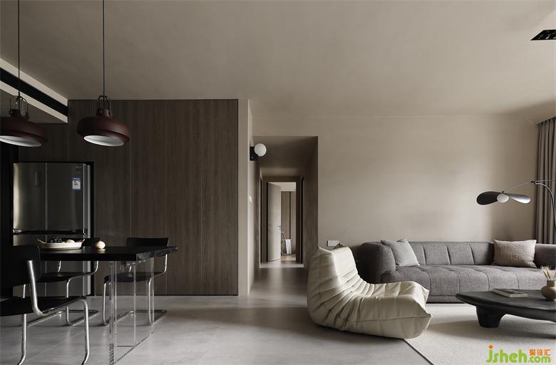 啞光水泥灰地磚一直延伸至餐廚區(qū),大體量的鋪貼,讓空間更加整潔干凈。家裝設(shè)計(jì)通過(guò)柜體的圍合、玻璃移門的分割,都弱化了空間的邊界感。