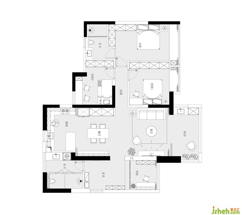 · 由于是老房裝修,現(xiàn)有格局無(wú)法滿足家庭五口人的入住需求,而生活場(chǎng)景的多義性已經(jīng)成為一種重要的生活方式,因此將入戶玄關(guān)左側(cè)的雜物間與生活陽(yáng)臺(tái)一部分連通,家裝設(shè)計(jì)打造三分離公衛(wèi)和洗烘衣物區(qū)。右側(cè)劃分出多功能區(qū),日??僧?dāng)做琴房、書房、休閑區(qū)。