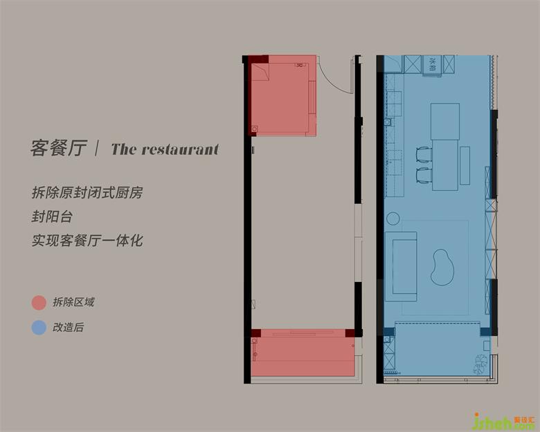 開放式的廚房好處是解放了原本局促的小空間,沒有了隔墻,動線也流暢起來。家裝設(shè)計一張定制大餐桌滿足了男女主日常的輕辦公,“懸空”的桌面,在視覺上變得輕量化,后方是客廳延伸過來的開放書墻,讓物品的拿取更加方便。