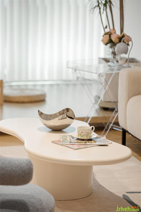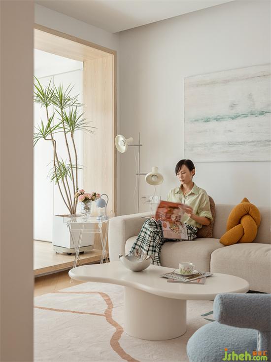 陽(yáng)臺(tái)并入客廳,利用地臺(tái)做出休閑區(qū),6㎡的空間打造出一個(gè)健身區(qū)兼茶室,同時(shí)也擴(kuò)大了空間視覺(jué)感。家裝設(shè)計(jì)平時(shí)女主經(jīng)常在這里健身做瑜伽,大面落地窗的優(yōu)勢(shì),導(dǎo)入了充裕的光線,適宜的綠植點(diǎn)綴,把空間襯托的更鮮活,一旁的收納柜也可以收納大件的健身器材和孩子的玩具,沒(méi)有電視的客廳,為三口之家的生活提供了無(wú)限可能。