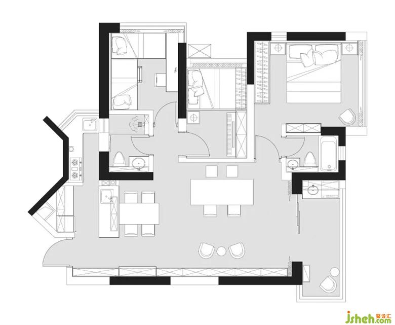 房子的原始結構是一個三室一廳的常規(guī)戶型,廚房的異形結構導致利用率低下,臥室的過道區(qū)域造成面積浪費,屋主想擁有中西雙廚的情況下盡可能讓空間顯得開闊,讓家人間的相處變得無間,同時為孩子打造一處學習玩耍的天地。