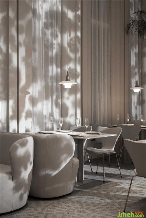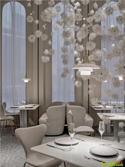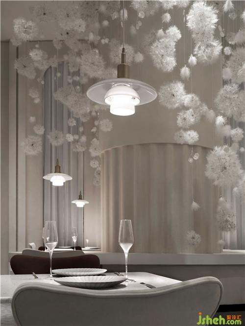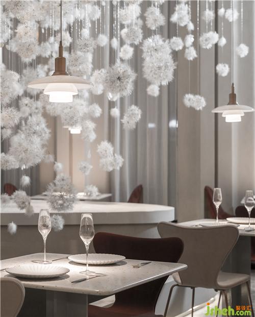 空間的物體線索來自蒲公英,我們設(shè)想蒲公英隨風(fēng)飄向大自然的和諧性,來自于生物和環(huán)境的有機互動,種子從母體脫離,散開飄動時產(chǎn)生的一種自然優(yōu)美感;于是設(shè)計師提取了蒲公英的概念去詮釋花廚的意義,上海餐廳設(shè)計把蒲公英的形態(tài)重新抽離組合,形成一種新的裝置藝術(shù)表現(xiàn)與空間對話,又相互彼此的消化著蒲公英的形態(tài);把藝術(shù)裝置作為主體,客戶作為飄散的另一個載體,嘗試將美好和美食傳播到外界。