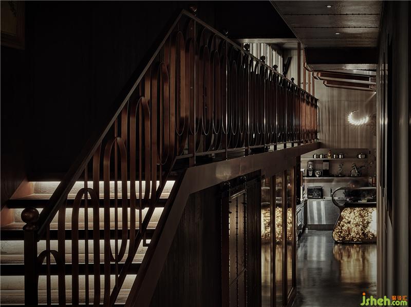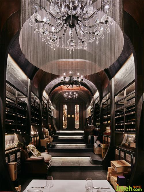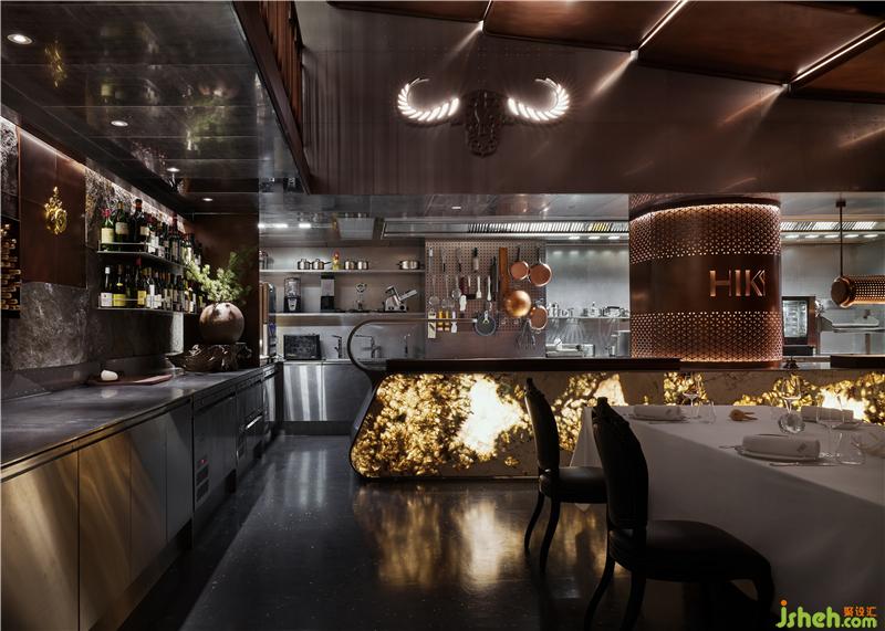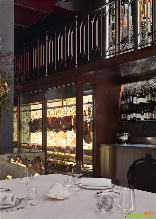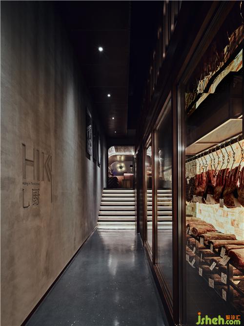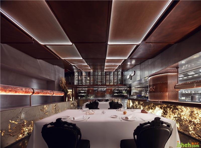 餐廳呈現(xiàn)出都市輕奢與工業(yè)復古的風格調(diào)性,空間中大量使用古銅及黑胡桃木,搭配泛光化的照明,給人溫暖自然的感覺上海餐廳設(shè)計。餐廳擁有采用喜馬拉雅巖鹽制成的干式熟成室、開放的食材儲存區(qū),可以讓客人能直觀地欣賞和挑選食材。