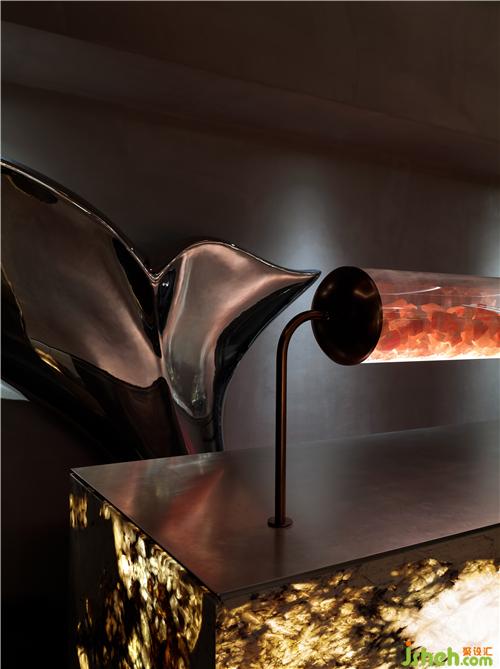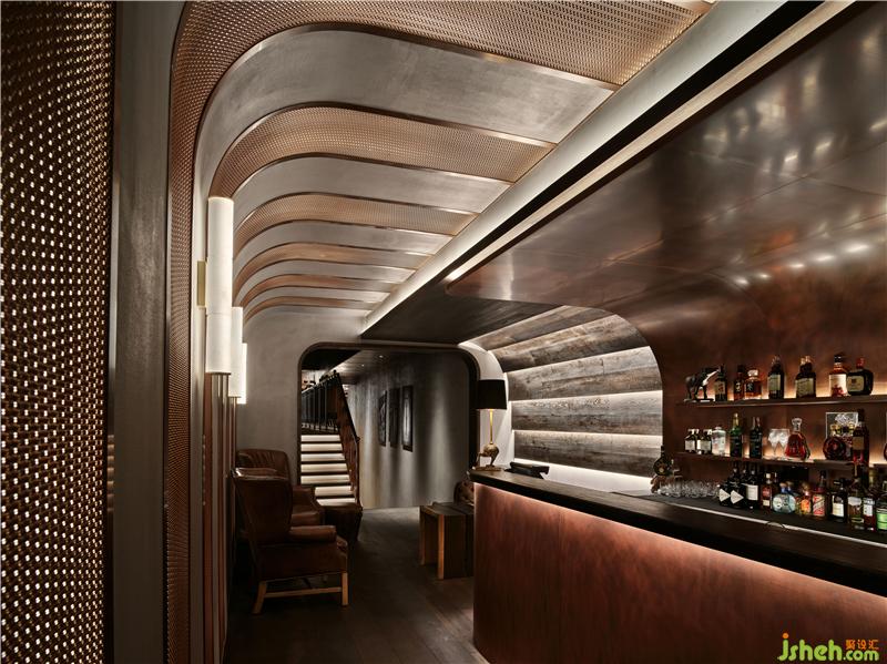 為了使客人們能感受到私廚的私密和體貼,設(shè)計師設(shè)立了循序漸進的動線。通過Stonesal餐廳吧臺邊隱藏的暗門,經(jīng)由金屬鑄成的LOGO墻到達私廚的入口,從而來到酒吧區(qū)。這樣的設(shè)計即保證了出入口的完整性,也增加了神秘感。酒吧區(qū)也給赴宴的客人們一個社交或小酌一杯的休憩之處。