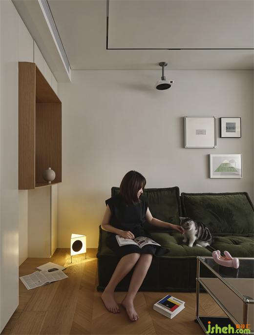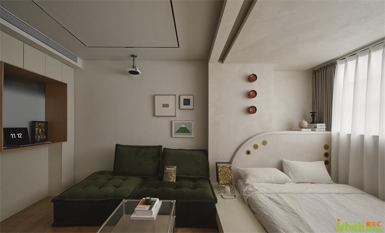 原本的臥室區(qū)域,設(shè)計(jì)師用空間膨脹的設(shè)計(jì)手法,改造成了客廳+臥室的復(fù)合空間。