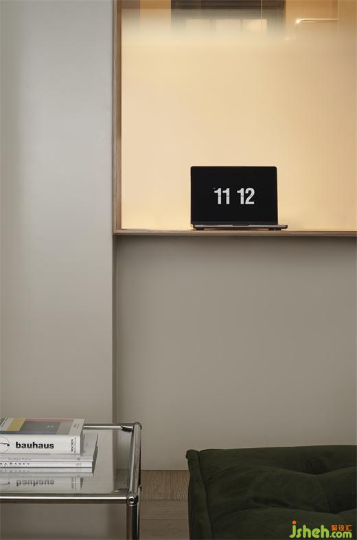 在衛(wèi)浴空間和客廳的交界處,是透光不透人的霧化玻璃,是家里的第二扇“窗”。Kate平時(shí)可以坐在窗邊愜意辦公。