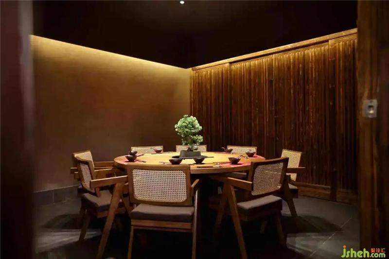 包房墻面采用微水泥材質(zhì),以粗糙的紋理打造原生態(tài)之意境,桌面的綠植端景,為空間抹上一點(diǎn)綠。隱藏式燈帶營造一種神秘感,暖黃的燈光不僅為用餐提供了和諧氛圍,更巧妙的通過設(shè)計引導(dǎo),將顧客的目光聚焦到美味菜肴上,提高食物的色彩飽和度打造讓人看了就垂涎欲滴之心理效應(yīng)。