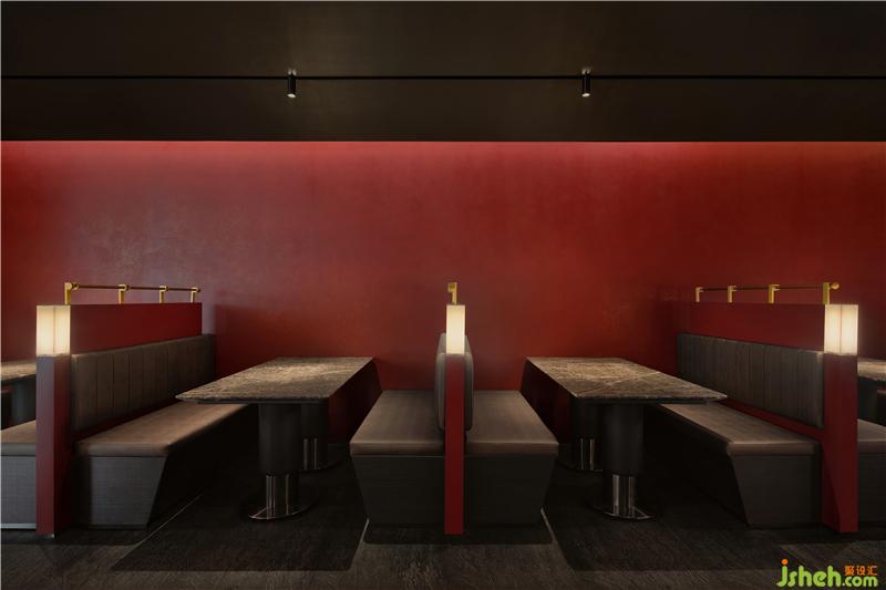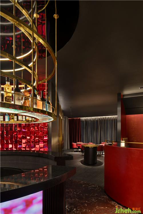 初步入餐廳,環(huán)抱式前臺為客戶展開熱情的問候呈現(xiàn)儀式感,曲折蜿蜒帶領(lǐng)人開啟探索之旅,水晶玻璃磚以重復(fù)、組合的秩序布滿墻面,在紅色的燈光渲染下神秘且魅惑,引人遐想。