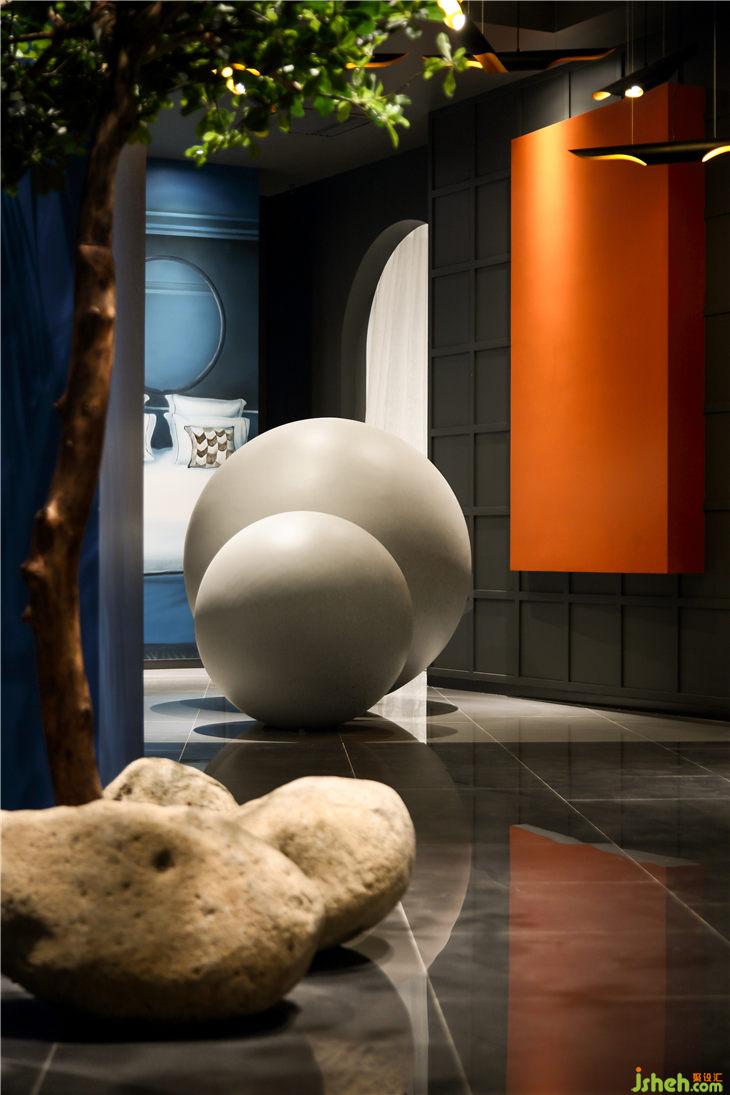 多形式的混合照明有利于形成良好的室內(nèi)環(huán)境,面光與墻面光互相配合,無論是規(guī)律的牛眼燈,還是從井格射出的光線,抑或后現(xiàn)代雙管鋁筒斜管燈,設計性和存在感都是其特色,或靜或動或明或暗,圍合出一種光羽琤琮,朗月澄明的空間意境。