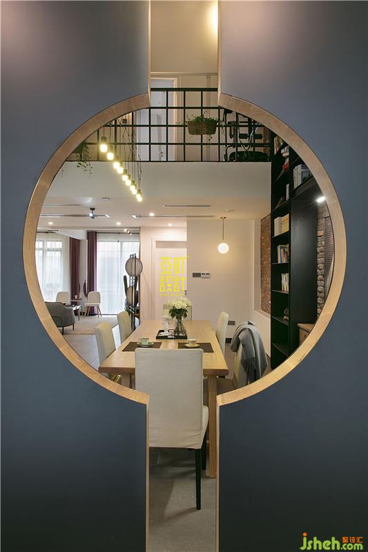 首先映入眼簾的是7.5米挑高區(qū)——餐廳區(qū)域,也是整個家里的靈魂區(qū)域,用餐、party、看電影、手工制作等都集中在這個通透的區(qū)域,背部是紅色文化磚的到頂鋼板書架與左側(cè)的白墻形成疏密對比,兩扇錯落的小木窗及格子鐵藝扶手是一層與二層的連接窗口。