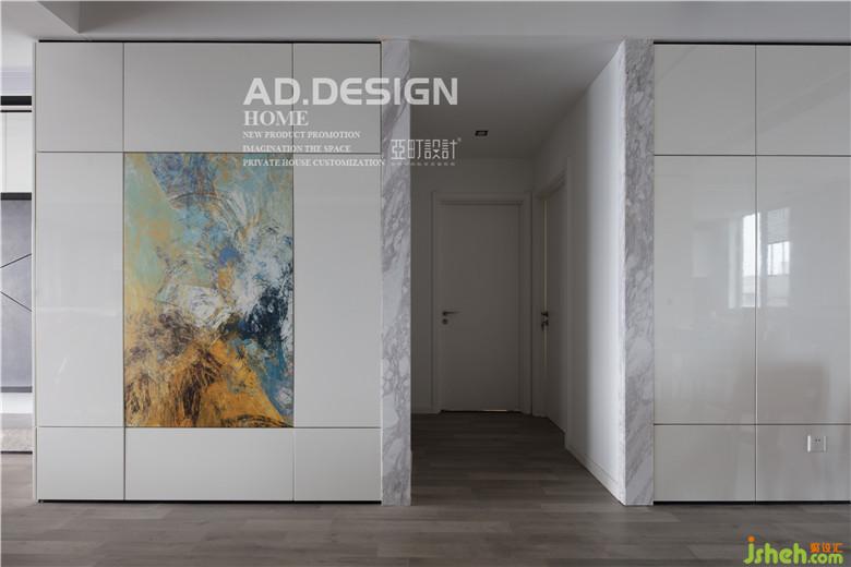 入戶進門處空間十分開闊,室內(nèi)設(shè)計師為了與餐廳墻面齊平,特地設(shè)計了一面造型柜。走進玄關(guān),即感到簡潔優(yōu)雅。靠近餐廳的整體柜一直延續(xù)連接至廚房櫥柜,使得廚房和餐廳的地面、墻面、天花形成一個完美的拼接。