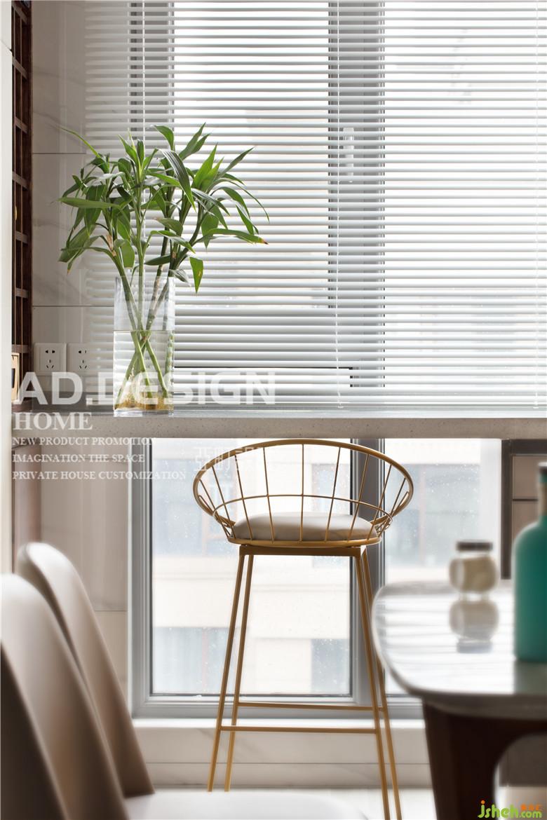 四人餐桌居中擺放,小而溫馨??看暗陌膳_,室內(nèi)設(shè)計師配上金屬高腳椅,腦海里閃現(xiàn)情景劇般的畫面:望向窗外夜色,舉起的高腳杯;或是沐浴著晨光,冒著熱氣的現(xiàn)磨咖啡,亦或是午餐過后,那美味可口的水果。