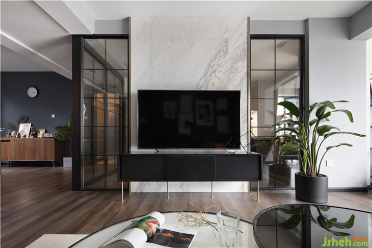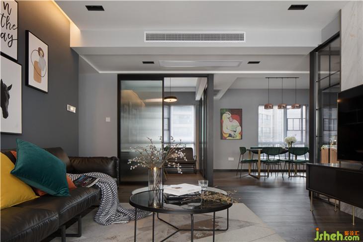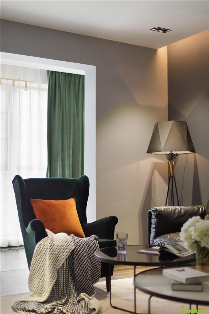客廳的黑灰色皮質沙發(fā)結合墨綠色的斯家蒙的單椅,與景觀陽臺的黑色馬賽克以及墨綠色窗簾相呼應,而電視背景墻則是由兩側透明的鐵藝玻璃隔斷與中間整面爵士白大理石構成,玻璃隔斷使客廳與廚房間隔開來,滿足了廚房因窗戶小采光不夠而增加了的兩側采光,而大理石則遮擋了背面廚房的西餐操作臺,增加了廚房的操作臺面的需求,又讓客廳因這面電視背景墻而更加生動。