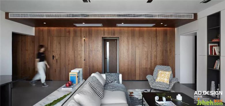 入戶在原始結(jié)構(gòu)上對原墻體做了一些調(diào)整,將鞋柜內(nèi)嵌進墻體,從入戶連結(jié)過道設(shè)計一整面的木質(zhì)背景墻面,裝修公司將臥室和廚房的門也融合在其中,頂面與墻面的木質(zhì)組合構(gòu)建出整個空間的視覺中心點,定下全房的主體格調(diào),在過道盡頭一整面柜體式的電視背景墻面,既創(chuàng)造一個簡約大方的視覺感官,也具備強大的家居儲納功能。