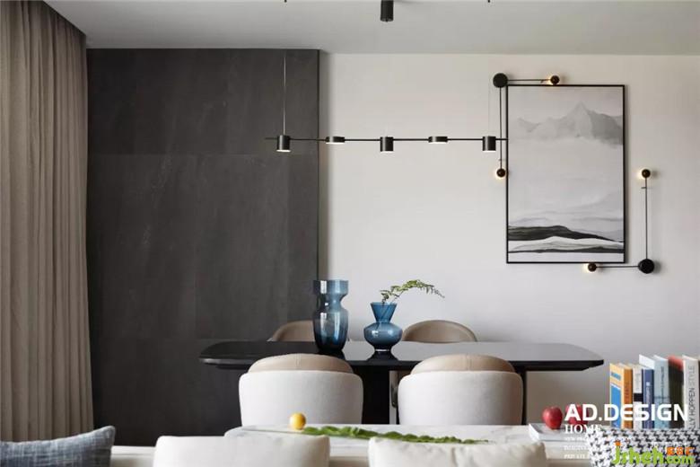 客餐廳整體的空間體驗從頂面內(nèi)嵌的黑色燈具做區(qū)分,既是一體,又各自分離,餐廳區(qū)域墻面的留白給到大幅掛畫的空間,裝修公司配合壁燈燈光的映射,讓空間變得更加靈動。