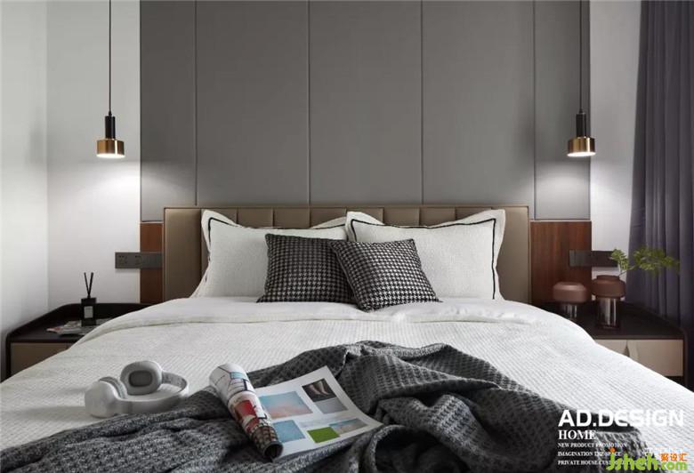 主臥空間裝修公司在床頭背景用部分的木飾面與客廳餐廳公共區(qū)域相呼應,硬包墻布的設計增加床頭的舒適度,豎向的分隔與電視墻面造型相平衡,在墻布的素雅的映襯下,頂面無主燈的現(xiàn)代照明設計讓空間更具高級感。