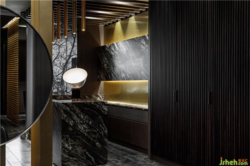 石材、金屬、木質(zhì)格柵、圖騰,在四種元素交織的語匯下,藉由光影把之間特色更顯得展露無疑,圖騰像是存在于虛與實的錯綜里,與外面的動態(tài)讓人產(chǎn)生錯覺。金屬折射的鋒芒,蔓延在石材當(dāng)中,他們的言語纏綿著木紋,逐漸串連整個場域,更貫穿于空間最深處,訴說彼此的精神訴求,透過光影交錯與材質(zhì)間的本質(zhì),打破顏色間最沉默的原色。