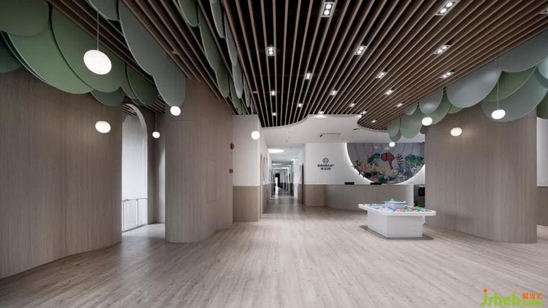 圓的元素在空間中的表達(dá),比其他的圖形都更加有意義。學(xué)者伊麗莎白·闊特對(duì)肯尼亞兒童和成人的研究,因格瑞德和斯文安德森對(duì)納米比亞黑巴部落成員的研究,都證實(shí)了這個(gè)觀點(diǎn)。兒童涂鴉期出現(xiàn)的圓形,往往被賦予了“人”的意義。孩子“最初畫(huà)出的真正表征性的形狀就是圓形和橢圓形”。“因?yàn)閳A形的簡(jiǎn)潔和完美,人的視知覺(jué)就會(huì)把它挑選出來(lái),對(duì)它產(chǎn)生偏好”。設(shè)計(jì)師把大樹(shù)的元素抽象簡(jiǎn)化后,提取圓形幾何圖形,為營(yíng)造參天大樹(shù)的視覺(jué)感受,特意把圓形截取部分融入在天花里面,以小孩的視覺(jué)感受出發(fā),只看到大樹(shù)的下半部分,形成猶如幾棵參天大樹(shù)聳立云霄的視覺(jué)感受。