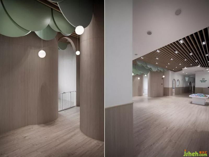 在其他空間的設(shè)計(jì)上同樣延續(xù)圓形的形狀去探索與孩子們的交流,希望能夠讓孩子們更快地去融入到這個(gè)空間里面;營(yíng)造出像孩子們自己的家同樣的親切愉悅感受。在課室的墻上把教學(xué)黑板通過(guò)簡(jiǎn)煉的幾何圖形設(shè)計(jì),拉近空間環(huán)境與孩子們的心理距離。