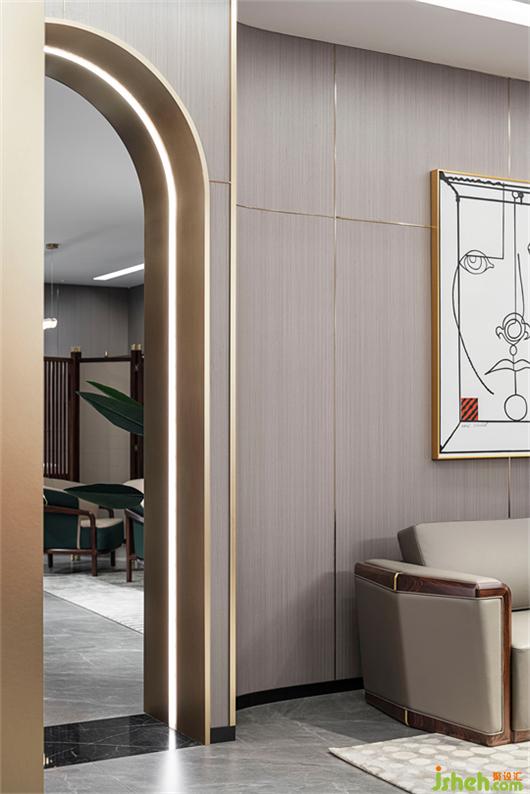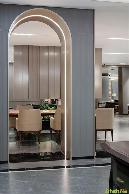 當(dāng)空間被劃分為不同功能空間時,需要用一個支點(diǎn)將空間各區(qū)凝聚起來。每個區(qū)域都有弧形造型來連貫,既貫穿各展示區(qū)域引導(dǎo)視覺動線,也以概念化手法呈現(xiàn)項目的核心理念。