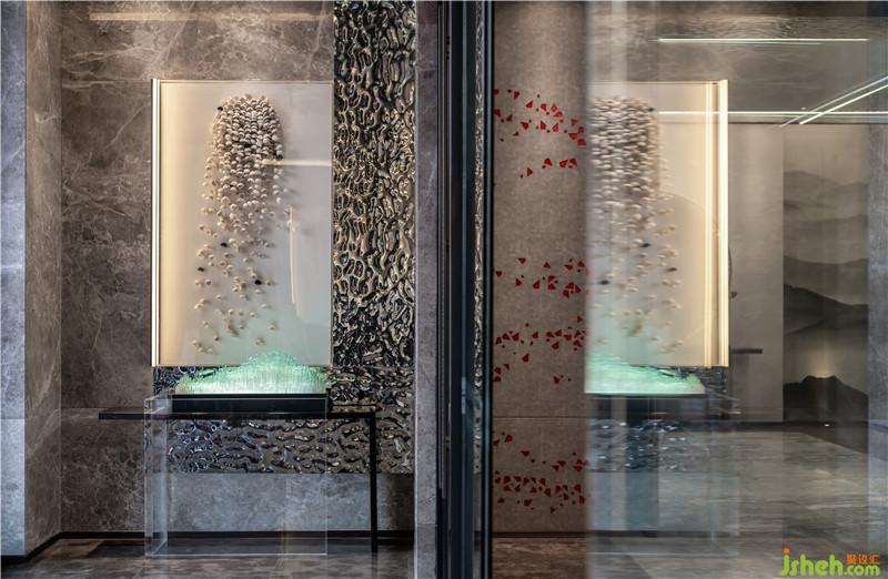 室內(nèi)空間圍繞兩條線展開,其一為“禮”,以傳統(tǒng)的禮序作為漸進(jìn)空間的打造,層層禮序、步步進(jìn)階,演繹“五進(jìn)”歸家之禮。其二為“趣”,由數(shù)量眾多的小缽狀組成的藝術(shù)畫作《漣》,賦有盆豐缽滿,豐收與財富匯聚于此。裝修公司