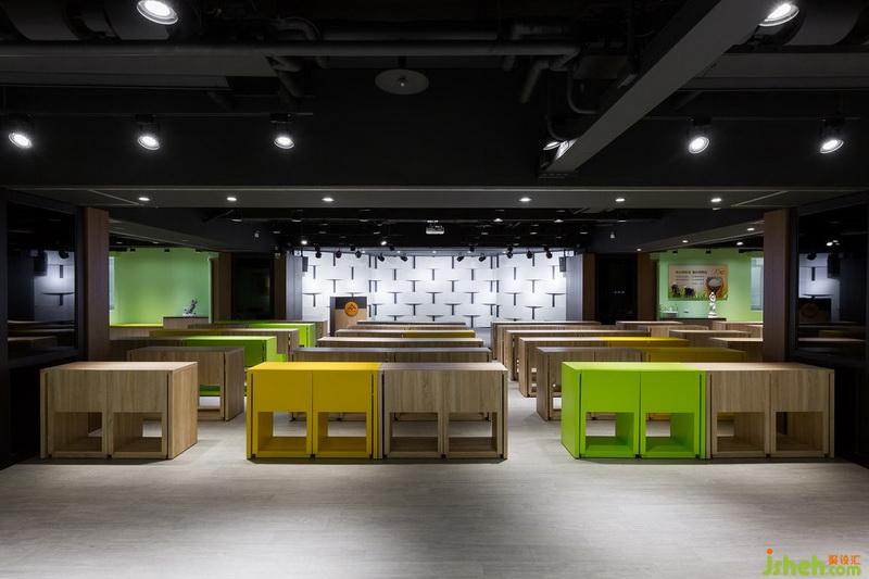 在風(fēng)格營造上,以鐵件框設(shè)利落的線條,柜臺(tái)天花板以流線木作拉伸視覺效果,鑿面石皮則注入獨(dú)特的粗獷感受,展演廳內(nèi)部繽紛的訂制桌椅與外露管線形成明暗對比,講臺(tái)壁面采用宛如編織方格狀的純白量體,搭配色調(diào)豐富的燈光設(shè)計(jì),聚焦觀者視覺。