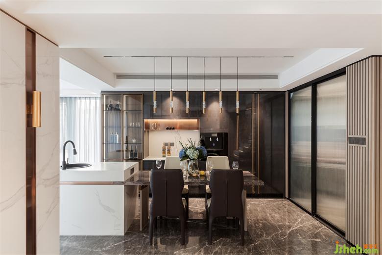 極具質(zhì)感的大理石,精致的金屬線條,高光木飾面板,皮革,絨布,巧妙的搭配,打造出一個舒適、簡練、奢華、溫馨、明亮的居住空間。一樓主要作為休閑娛樂的區(qū)域,在設(shè)計上,我們更多的去打開空間,讓整個空間更具靈動。對于復(fù)式樓來講,樓梯是設(shè)計的核心位置,通過對空間大膽的改造,合理的打造出精美的懸浮式樓梯。巖板作為當下的主流,極致的質(zhì)感追求,盡顯他的與眾不同,在背景墻、樓梯、吧臺等位置巧妙的運用,通過局部精致的金屬線條的合理搭配,共同打造空間質(zhì)感。 染色墻板的結(jié)合給空間增添了許多溫度,更有家的溫馨。地面采用了灰色大理石,自然的紋理給了更多想象的空間。局部奢石的點綴更給空間增加了奢華感。在于空間的設(shè)計當中,簡的存在主要體現(xiàn)在吊頂上面,在當下的時代,生活節(jié)奏的加快,人們對于簡的追求更加的強烈,在設(shè)計的過程中簡與奢的結(jié)合,使得空間更具漲性。