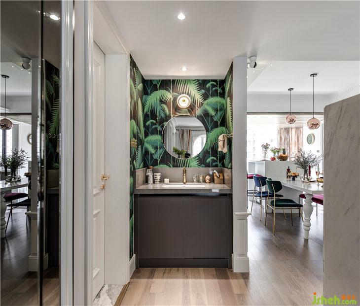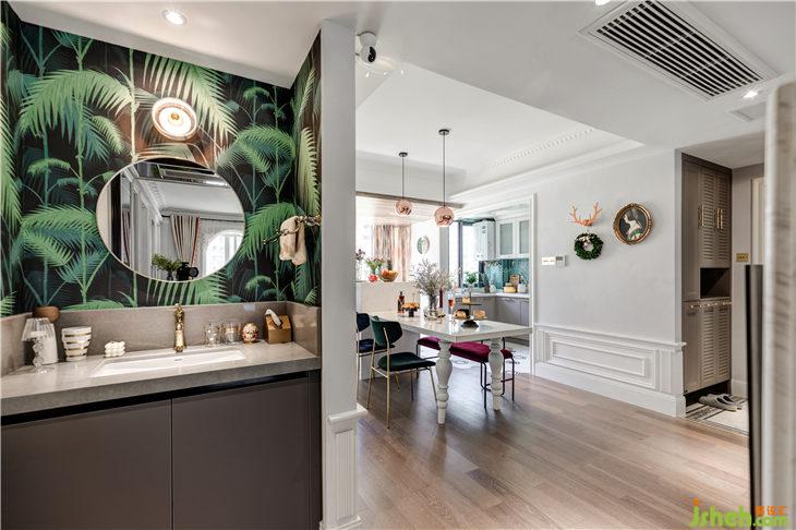 干區(qū)正好在客餐廳的中間過渡區(qū)域,我們將其融合到客餐廳里,選用了英國Cole&Son 進(jìn)口墻紙棕櫚樹,型號是:墨綠色 95/1003。