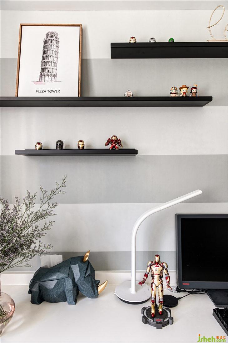 這里也是男主人的游戲娛樂室,業(yè)主喜歡游戲和收藏,設(shè)置了層次錯落豐富的置物架,展示著這些可愛的小物件。