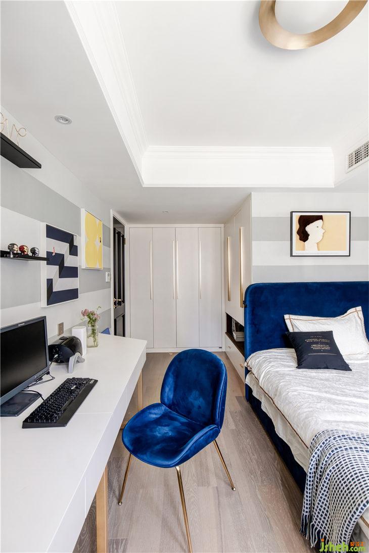 這里空間雖小,但一樣有著大大的儲藏空間,打開房門,是兩個整面的儲物柜,書桌也是很寬很長,防止桌角對外,會有一定的安全隱患和視覺壓抑,我們將桌角斜角處理。