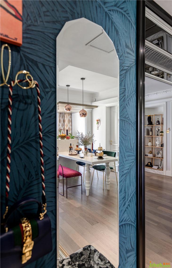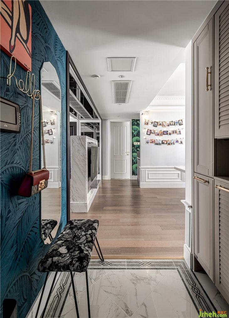 開門入戶,時(shí)尚混搭氣息撲面而來,左手邊是比利時(shí)arte進(jìn)口墻紙,圖紋是熱帶雨林的葉子,深藍(lán)的靜謐與凹凸有致的紋理搭配時(shí)尚跳色掛畫,金色英文字母“hello”掛鉤,右邊棱角分明的全身鏡,地面是經(jīng)典法式花紋圍邊,右邊扣線門板加百葉門板的組合配上精致復(fù)古的把手,野獸派獨(dú)特花紋的細(xì)腿長(zhǎng)凳,每一個(gè)細(xì)節(jié)都將精美質(zhì)感伶俐體現(xiàn),一個(gè)時(shí)尚復(fù)古的混搭之家,就這樣映入眼簾……